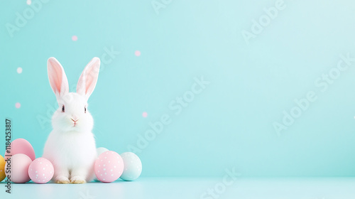 Obraz premium easter bunny with easter eggs - blue studio background.
