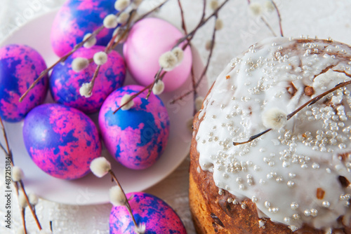 © Elena, Obraz premium Easter cake with purple eggs and willow branches close