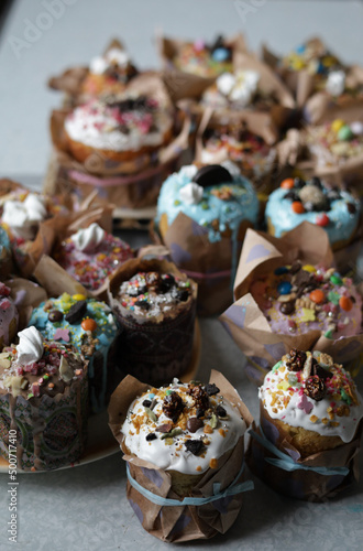 © Anna_dnch, Naklejka premium Easter cakes on the table Happy Easter. Homemade cakes for holidays, healthy food, healthy sweets for children
