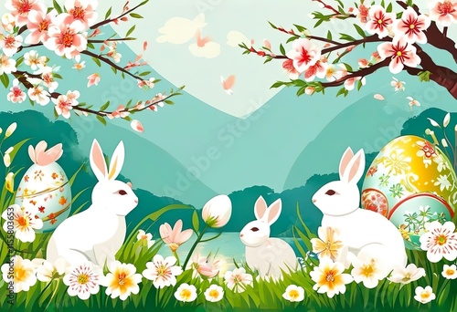 Fototapeta premium Easter card, 2025 banner in Japanese style, Easter eggs and Easter white bunnies in a clearing under sakura trees, Happy Easter