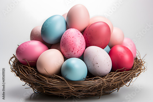 © fadi, Naklejka premium easter card, easter bunny with eggs, easter eggs and flowers, easter eggs in a basket, easter eggs and flowers on a white background, easter wall paper and background for social media
