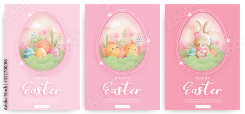 Fototapeta premium Easter card with cute bunny and chicken in paper cut style. Vector illustration