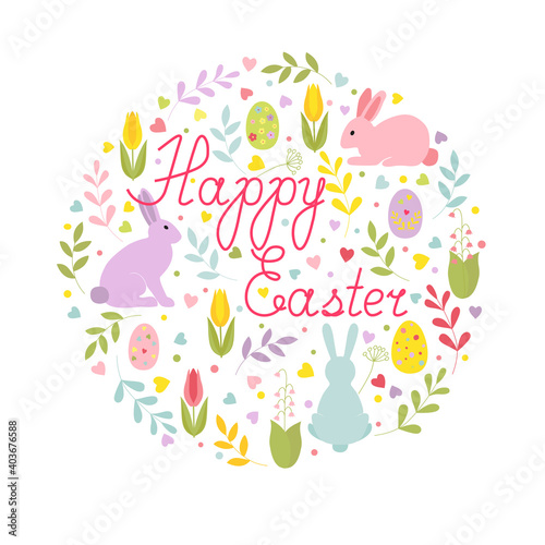 Fototapeta premium Easter card with cute cartoon bunnies, twigs, hearts, Easter eggs, flowers...