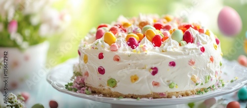 Fototapeta premium Easter celebration traditional cassata cake adorned with colorful candies and cream on festive table setting