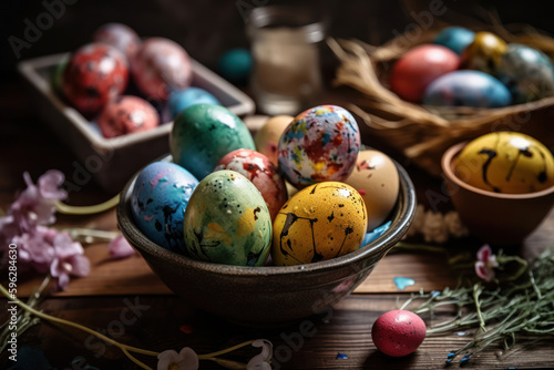 Fototapeta premium Easter colored eggs in a basket Generative AI.