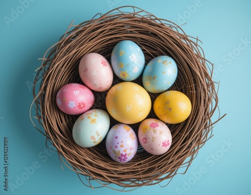 © Olesya, Fototapeta premium Easter colored eggs in the nest on blue background