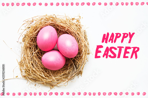 Fototapeta premium Easter colored pink eggs in egg nest, soft focus image. Happy Easter Card