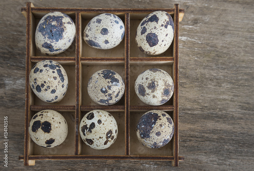 Fototapeta premium easter composition/box with quail eggs on old wooden background