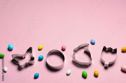 Fototapeta premium Easter Concept, Cookie Cutters and Chocolate Eggs on Pink Background