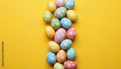 © Konstantin, Obraz premium Easter concept. Top view vertical photo of colorful easter eggs on isolated yellow background with empty space