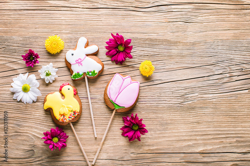 Fototapeta premium Easter cookies, gingerbread in the shape of a rabbit and chicken, spring Easter background with flowers