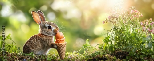 Obraz premium Easter Day celebration-themed. A cute rabbit enjoying ice cream in a sunny, green setting.