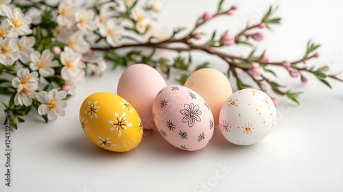 Fototapeta premium Easter day celebration with pastel tone eggs spring garden decorative scene...