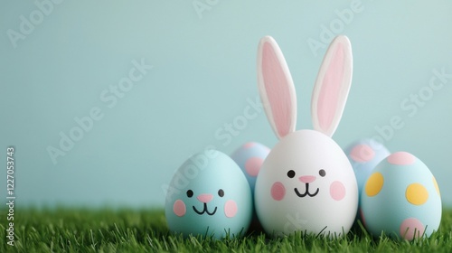© JCreative, Obraz premium Easter day concept. Cute Easter Eggs with Cartoon Bunny Ears and Cheerful Expressions