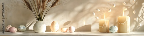 © colors, Fototapeta premium Easter decor on a beige background, featuring pampas grass in a vase and candles, perfect for spring.