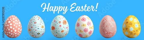 Fototapeta premium Easter, Easter eggs in a row on a blue background, with text, created with...