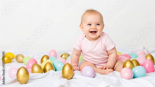 © Wonderful Studio, Obraz premium Easter egg baby. Happy baby surrounded by colorful Easter eggs on a light background.