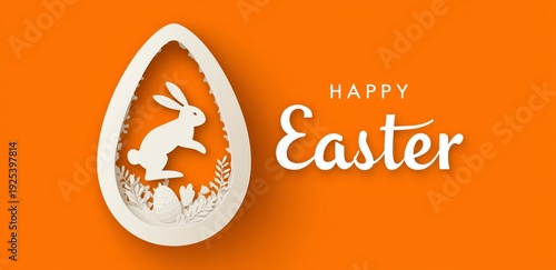 Fototapeta premium Easter Egg with Rabbit Silhouette Carving in White on Bright Orange Background