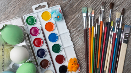Fototapeta premium easter eggs and colorful paints and brushes, bunny