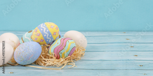 © Natee Meepian, Fototapeta premium Easter eggs and decorations on wooden background