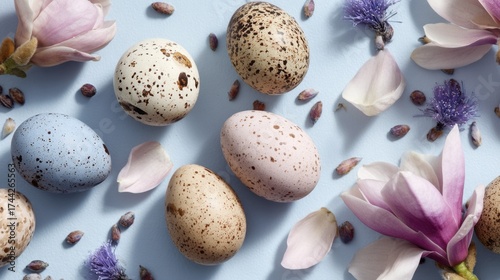© scrdy, Obraz premium Easter Eggs and Flowers Composition on a Light Blue Background Overhead View
