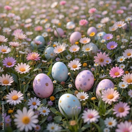 Fototapeta premium easter eggs and flowers on the grass, A spring meadow filled with blooming flowers and Easter eggs across the grass, easter day concept