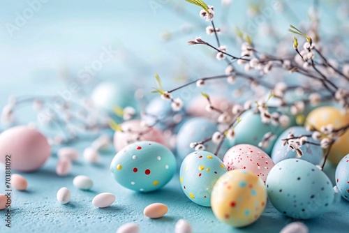 Fototapeta premium Easter eggs and spring flowers on a tree branch on a blue background. Happy...