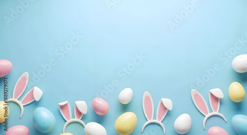 © sourav, Fototapeta premium Easter eggs background with bunny ears on pastel blue