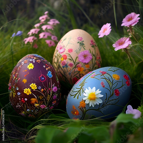 Fototapeta premium Easter eggs decorated with flowers in the grass AI generated