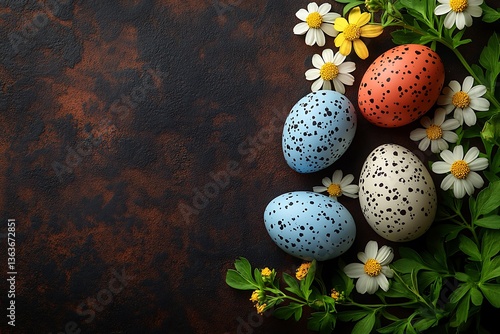 Obraz premium Easter Eggs, Flowers, Dark Background