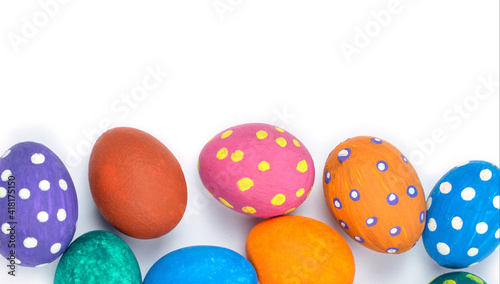 Obraz premium Easter eggs. Happy Easter card. Multicolored Easter eggs. Easter. Easter eggs on a white wooden background. Easter eggs. Isolate. Copy space