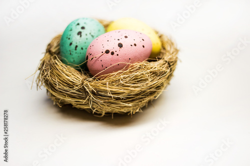 Obraz premium Easter eggs in a basket on a white background
