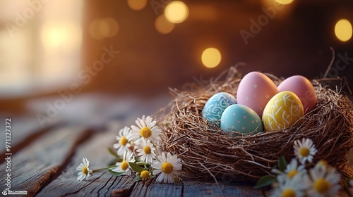 © bismillah_bd, Obraz premium Easter eggs in a nest with flowers