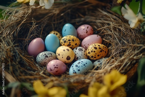 © Omor, Obraz premium Easter eggs in a nesting box with quail eggs that are beautiful and decorative. The idea of celebrating Easter. Generative Ai