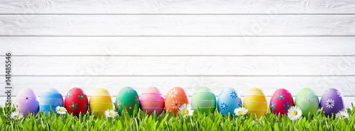 © Romolo Tavani, Obraz premium Easter Eggs In A Row And White Wooden Background