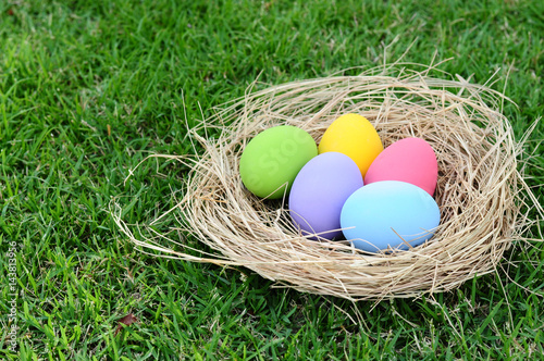 © canjoena, Obraz premium Easter eggs in nest on grass background