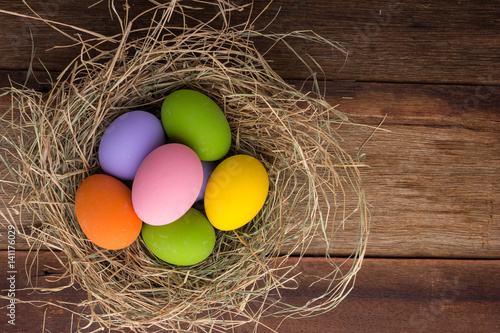 © ducksmallfoto, Fototapeta premium Easter eggs in nest on old wooden background