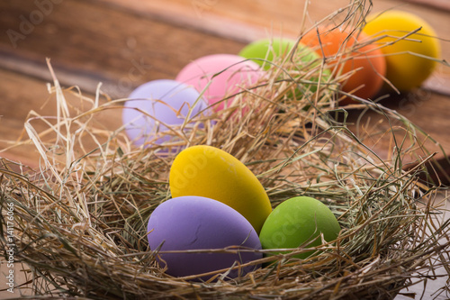 © ducksmallfoto, Fototapeta premium Easter eggs in nest on old wooden background
