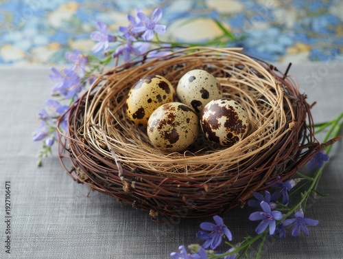 © BillionPhotos.com, Obraz premium Easter eggs in nest with spring flowers, AI generated image