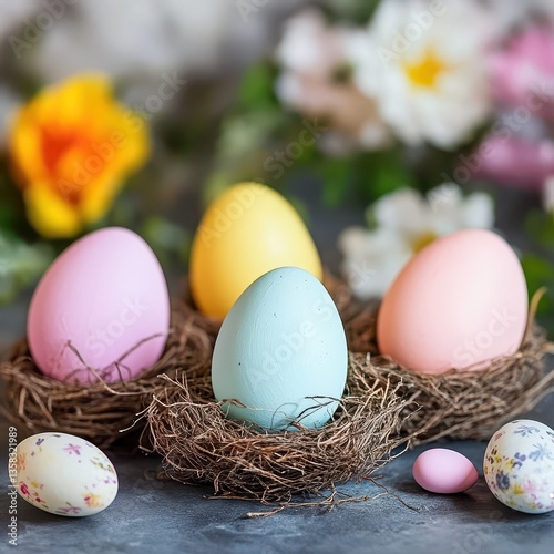 Fototapeta premium Easter eggs in nests with flowers