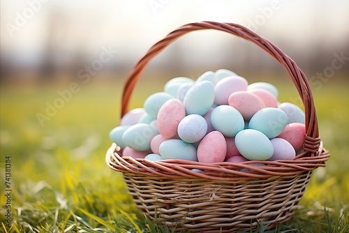 Naklejka premium Easter eggs in pastel colors, wicker basket on green meadow background,...