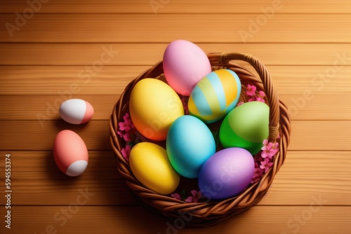© Aleksandr, Naklejka premium Easter eggs in the nest on rustic wooden background, generative ai, copyspace for text