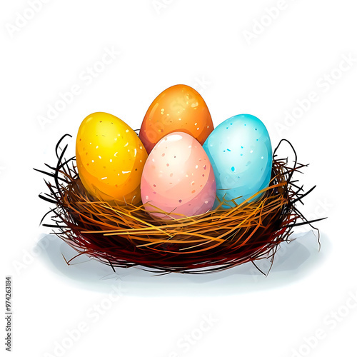 © jianghaistudio, Obraz premium Easter eggs in the nest on white background.