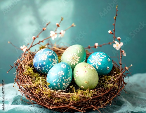 © Na, Obraz premium Easter eggs nest spring backdrop