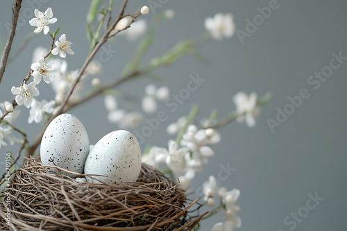 © TheseusStock, Obraz premium Easter eggs nestled in bird nests and willow branches, adorned with white flowers against a gray background, creating a concept with ample copy space.