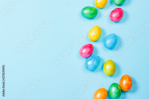 © Alex, Obraz premium Easter eggs on a blue background. Easter celebration concept. Flat lay, top view