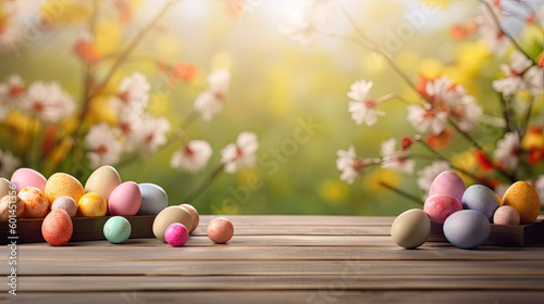 Obraz premium Easter eggs on a wooden floor and a blurred spring meadow in the background. Generative AI