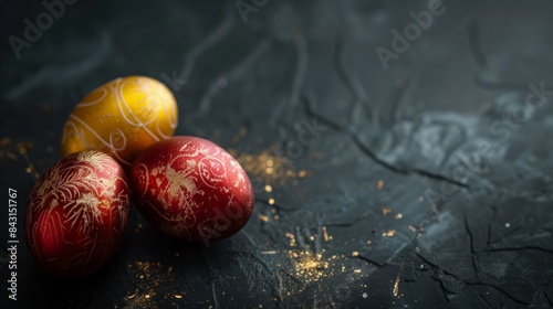 Fototapeta premium Easter eggs on dark background, moody Easter card.