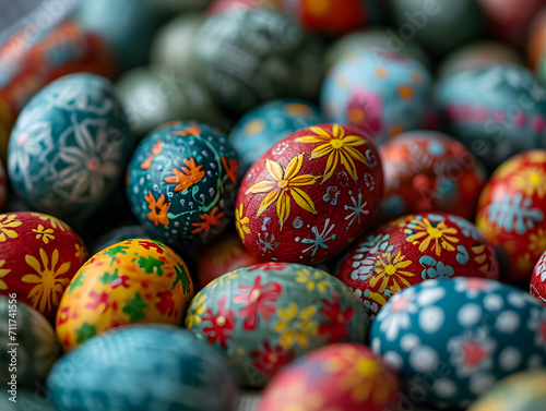 Fototapeta premium Easter eggs painted in different colors and patterns on a wodden background