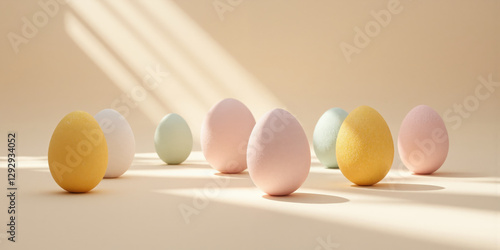 Fototapeta premium Easter eggs painted in muted pastels rest atop a smooth beige gradient, their...
